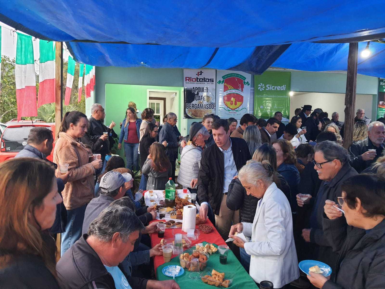 O Café Bergamasco é realizado pelo Circolo Bergamasco di Rio Maina e, desde outubro de 2007, o evento já percorreu mais de seis municípios da região. É realizado sempre no último domingo de cada mês na casa de uma família italiana ou simpatizante da cultura italiana. A família recebe com o café, o Circolo leva o vinho, o grupo Belunesi faz a cantoria e cada um que chega traz uma guloseima. O espírito do Café Bergamasco é o congraçamento das famílias. Auguri a tutti!!!