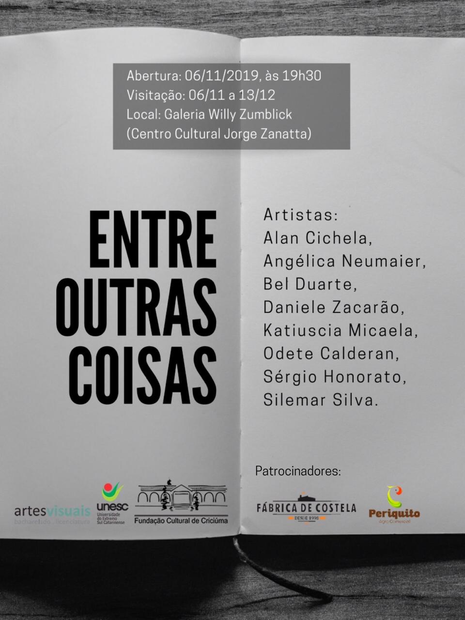 A galeria de arte contemporânea Willy Zumblick, que fica no Centro Cultural Jorge Zanatta, irá receber mais uma exposição. A mostra “Entre Outras Coisas”, inicia nesta quarta-feira (06) e foi organizada pelos alunos da 6° fase do curso em bacharelado de Artes Visuais da Universidade do Extremo Sul Catarinense (Unesc) e vai contar com instalações e ilustrações.